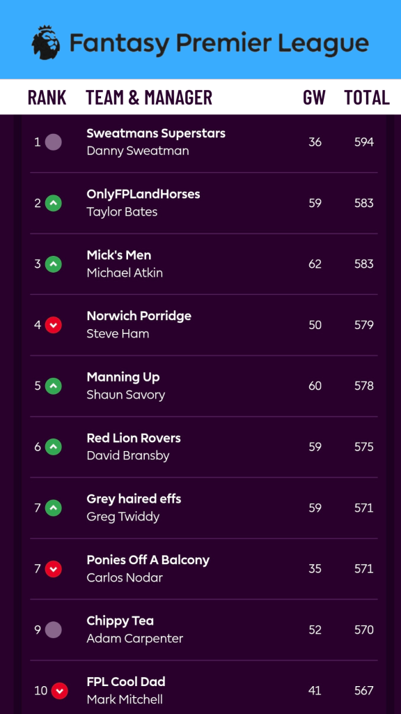 - OnlyFPLandHorses holds 2nd with 583 points, tying on total points with Mick’s Men in 3rd.